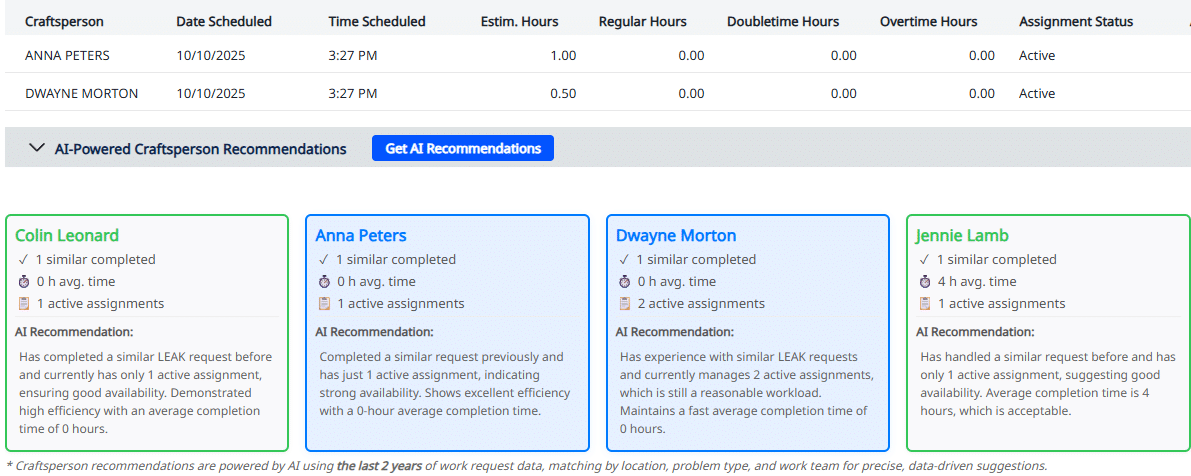 AI analyzes 2 years of work request history to recommend the best-fit craftsperson based on team, availability, location, and performance.